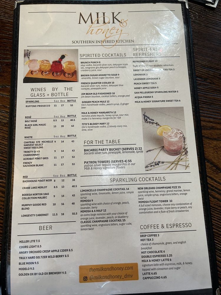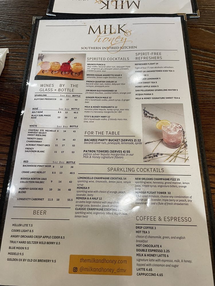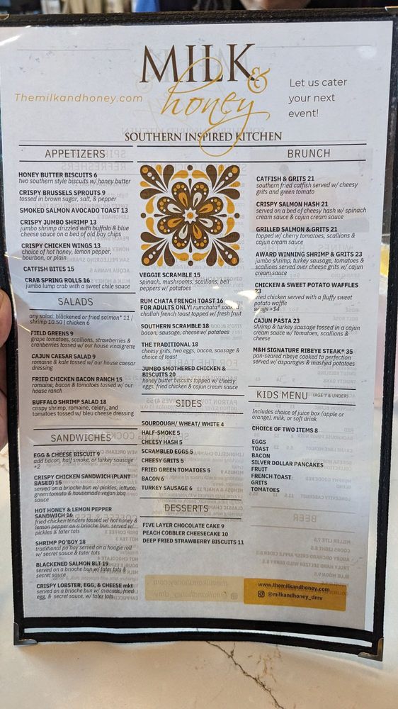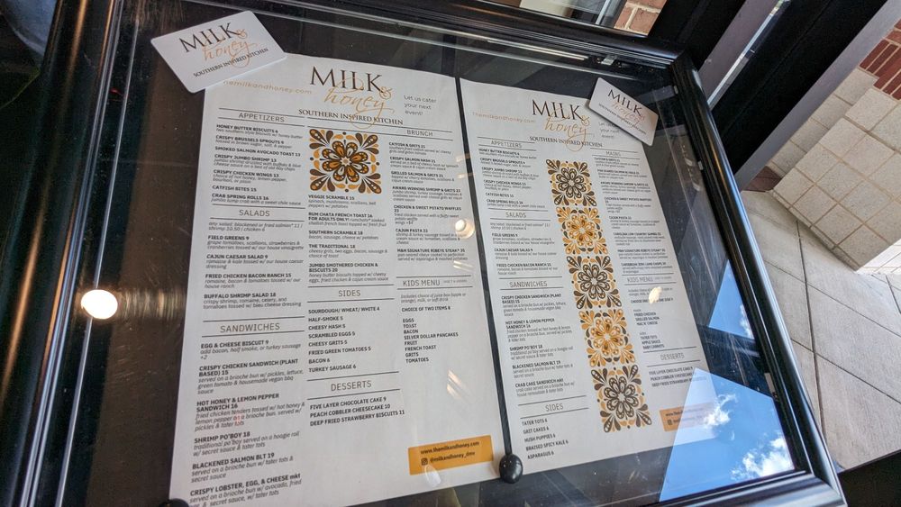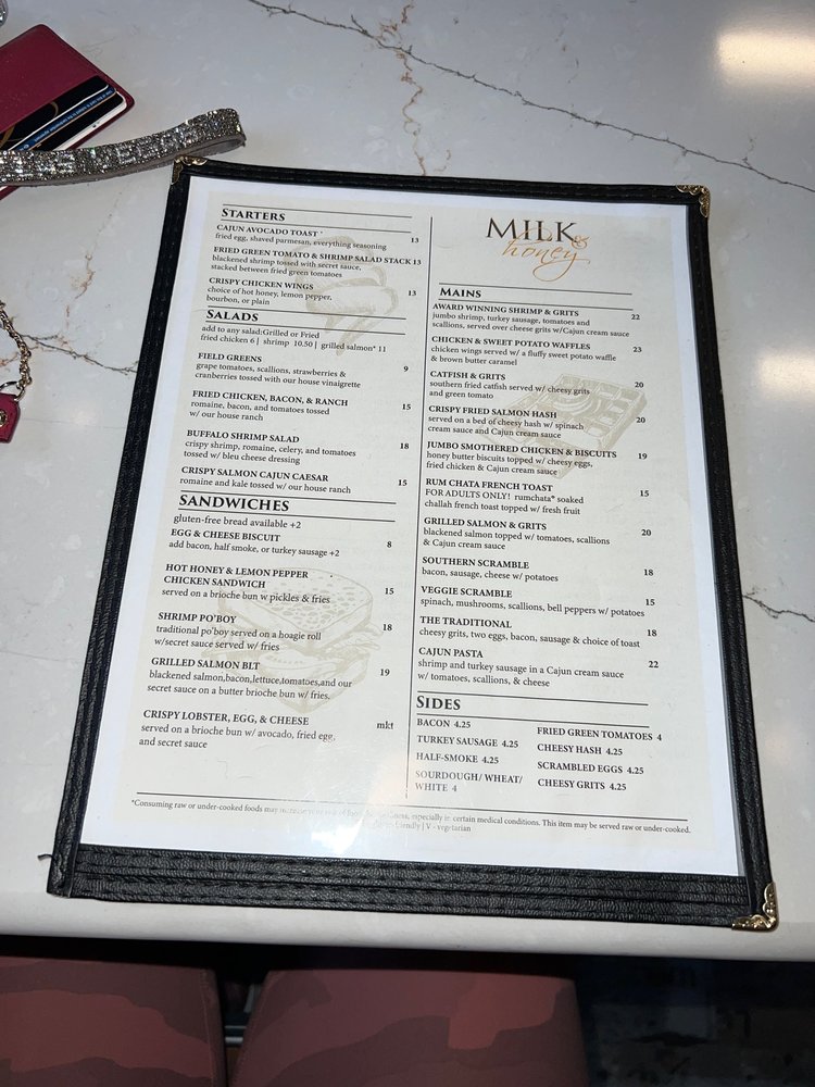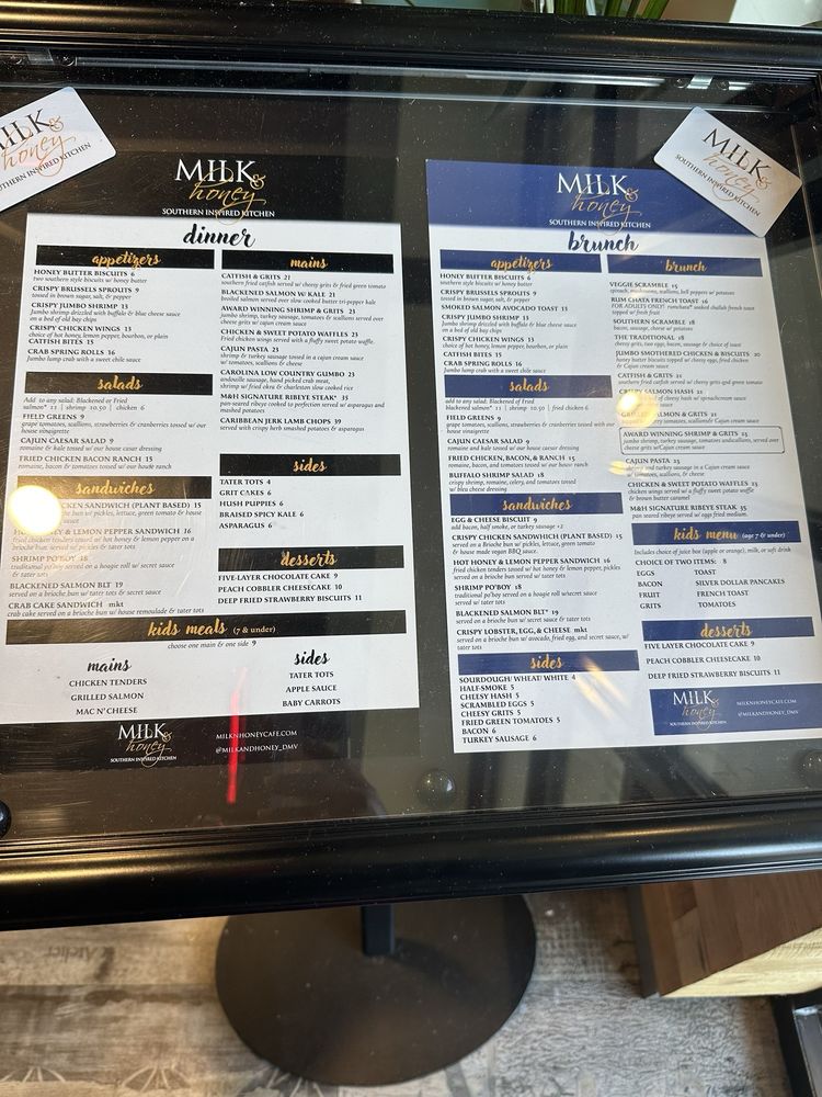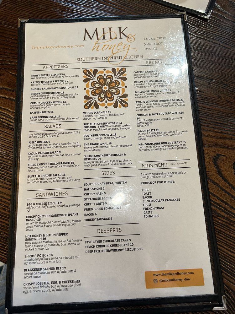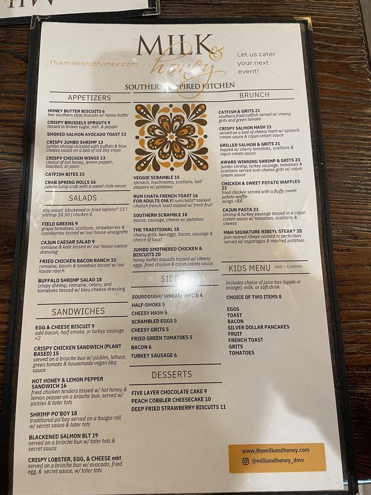 Introducing Milk & Honey Cafe, a trendy Southern-Soul food haven in Sterling, VA, offering a diverse range of options from hearty breakfast to seafood delights. The menu boasts mouthwatering starters like Honey Butter Biscuits and flavorful Crispy Chicken Wings. Indulge in inventive salads like the Buffalo Shrimp Salad or the Fried Chicken, Bacon, & Ranch. For sandwich lovers, the Hot Honey & Lemon Pepper Sandwich and the Blackened Salmon BLT are sure to please. Customers rave about the rich flavors and generous portions, with standout dishes like the jumbo smothered chicken and biscuits, award-winning shrimp and grits, and a delightful sweet potato waffle. The cozy ambiance and attentive service make dining at Milk & Honey a delightful experience for all. Whether you're a brunch enthusiast or a seafood lover, this Black-owned gem is a must-visit destination.